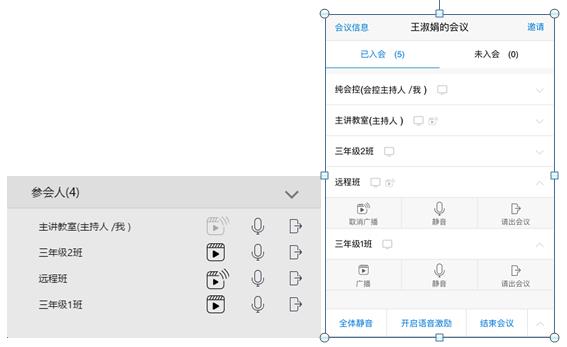 為了迎合【雙師課堂】中主講教室需要與某個分教室互動的場景,現特別推出視頻會議“廣播”功能。當老師想點名某個分教室互動時,只要操作廣播這個分教室,此分教室的視頻和聲音就會傳播到所有的分教室以及主講教室中。