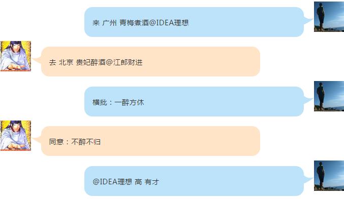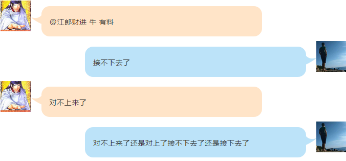對話背景: 70后領導(@IDEA理想)在群里上了一張圖:一雙筷子,一個碗,一份菜,一杯酒。 80后員工(@江郎財進)在群里接話…… |