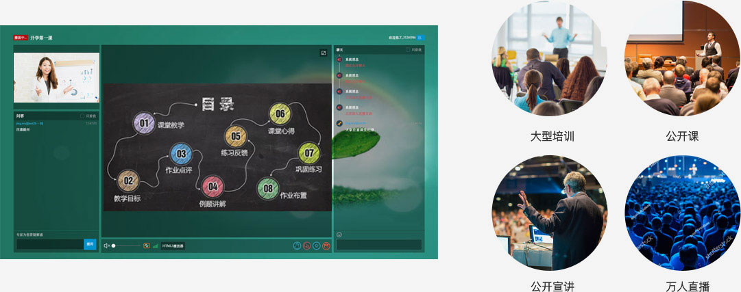 支持網頁和客戶端兩種方式登陸,網頁用戶可以根據需要切換到客戶端,采用音視頻、文檔、文字互動混合傳輸交互形式,讓直播“活靈活現”