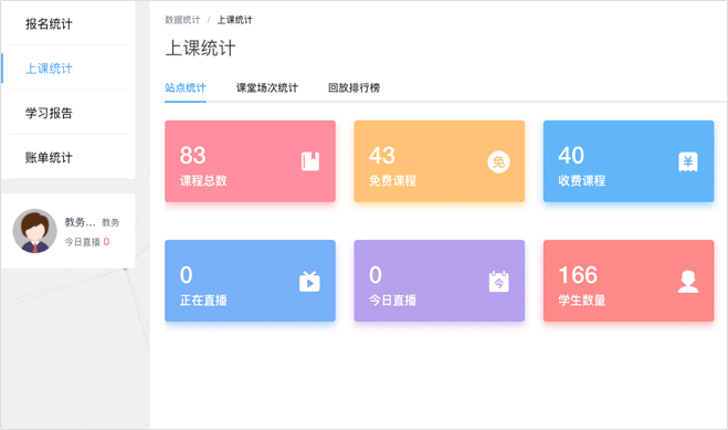 擁有教務管理、用戶管理、網校設置等多項后臺功能;建班排課,輕松操作; 招生情況、上課情況、隨時掌握。