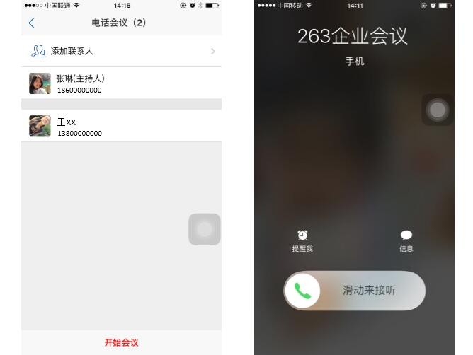 主持人在手機客戶端發起會議后,參與人員就會接到來自“263企業會議”的電話