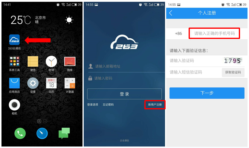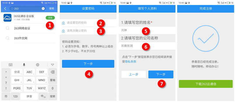 在安裝步驟上,原263企業郵件用戶可直接使用263郵箱進行登錄,新用戶注冊也相當方便,根據步驟提示分分鐘就能完成賬號設置,在對密碼和個人資料進行完善后即可輕松開啟263云通信的移動辦公之旅~