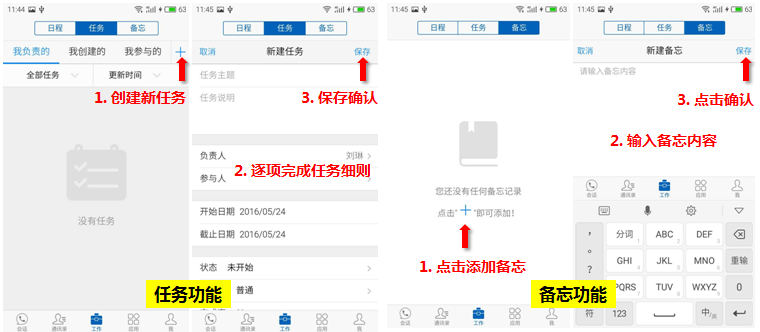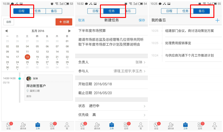 根據測評,新增的“任務”和“備忘”兩項功能同樣是操作性極佳:找到并點選相關工作界面中的“+”,即可進入新增任務和備忘頁面,完成你的工作安排和記錄。最大的亮點來自“任務”功能,除了相關主題和內容的描述外,263EM還人性化的設置了相關責任人、時間、任務狀態等選擇,且無需手動輸入,只要點擊相關條目,即可輕松完成設置。