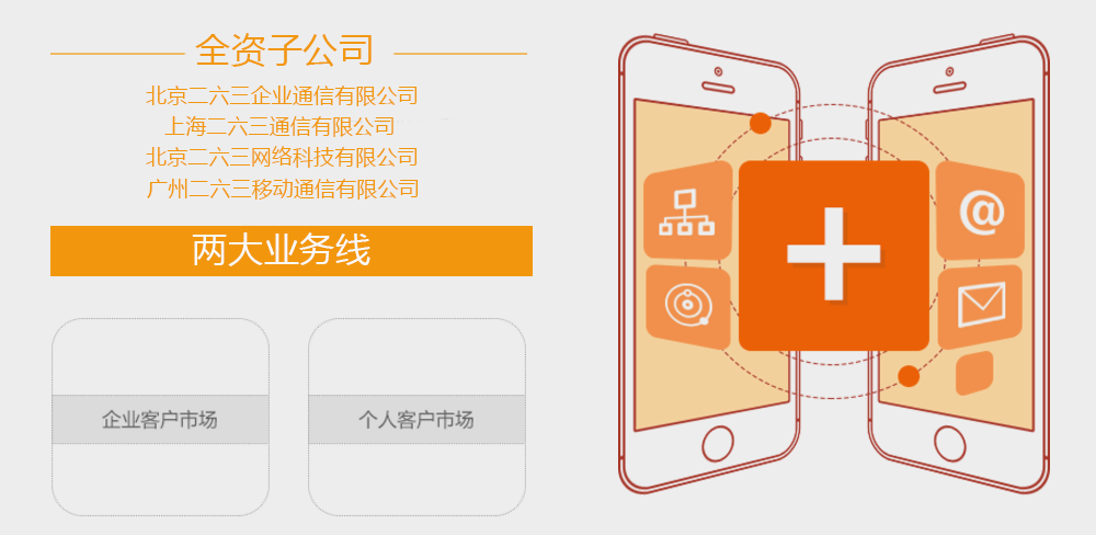 企業通信業務線包括【北京二六三企業通信有限公司】和【上海二六三通信有限公司】,為國內各行業、各規模企業提供基礎通信集成服務和企業統一通信協作服務;個人通信業務線包括【北京二六三網絡科技有限公司】和【廣州二六三移動通信有限公司】,為全球商旅華人和海外華人提供便捷、實惠的通信選擇。