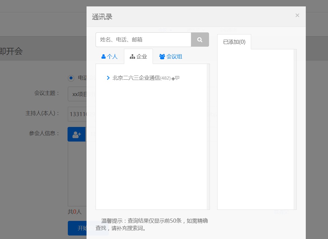 立即開會使用起來比較方便,輸入會議主題,設定會議主持人和參與者即可發起。會議發起者可以手動輸入參會人員電話信息,也可以從企業通訊錄中選擇參與人員。