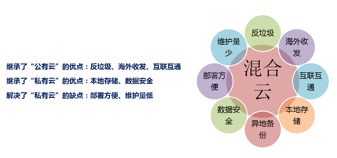 263企業郵箱混合云解決方案既充分發揮了"公有云"的優勢,為用戶提供諸如:海外收發、南北互通、安全管理、防釣魚、反垃圾郵件系統等等云端服務,又充分發揮了"私有云"的優勢,為用戶部署穩定、安全的本地系統。