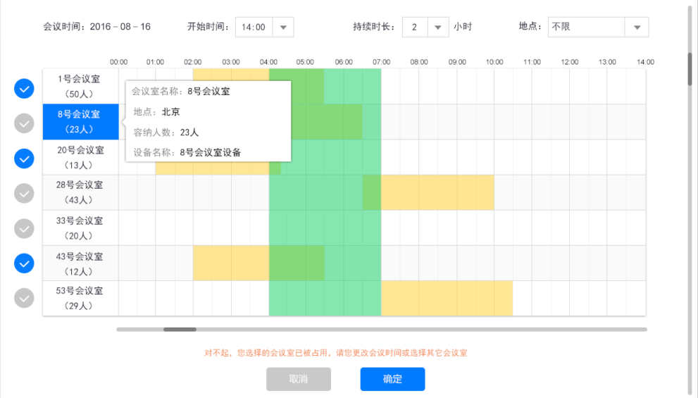 再選擇會議的開始時間(必填項),如果這場會議需要硬件視頻設備參與會議,請選擇會議室;