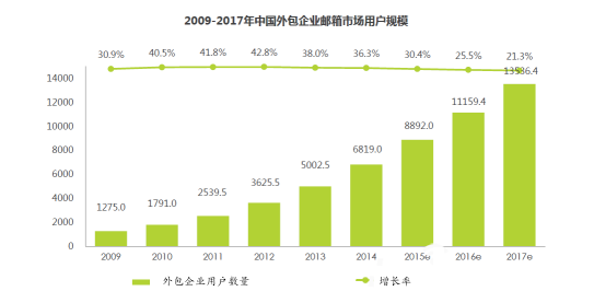 根據艾瑞相關報告分析及預測:2014年,中國企業郵箱用戶規模僅為6000萬左右,但隨著政策環境變化、技術革新等因素的正面影響下,截止到2016年底企業郵箱用戶規模達到1.12億,并且趨勢還在不斷上漲,至2017年底,將有望達到1.35億。由此可見,電子郵箱在企業辦公應用中已成為不可或缺的重要環節,并且企業郵箱的普及性和重要性也在逐年增長著。