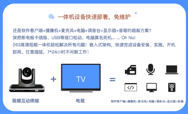 作為263雙師課堂的最大亮點,一體機節省了攝像機、麥克風、顯示器等組合方案部署的時間,同時避免了斷電板卡燒毀、電腦死機等情況發生。采用了嵌入式架構,開機即用,任意插拔,并支持7*24小時不間斷工作。高度集成的緊湊外形設計幾分鐘即可完成設備安裝、實施。