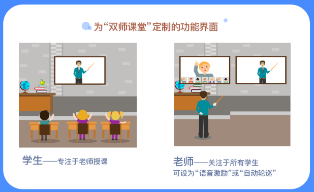 分別從學生、老師兩個角度改善在線視頻教育的使用體驗。學生,專注于老師授課的內容;老師,可關注到所有學生, “1+1”的模式讓教學的效率提升,同時老師可以將課堂設定為“語音激勵”,當學生發言時,學生畫面可自動放大,或可通過“自動輪詢”方式保證老師與學生的互動性。