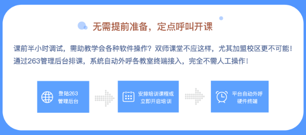 針對各大教育機構目前存在的課前調試時間長,助教素質良萎不齊等問題頻出,263雙師課堂無需任何人工操作,通過263管理后臺進行有序排課,系統會自動外呼各教室終端接入,省時省心省力。