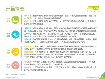 近日,知名分析機構iResearch(艾瑞咨詢)發布《2018年中國視頻云服務行業研究報告》,報告深入探討了視頻云市場的發展歷程、市場狀況、競爭格局及未來的市場趨勢和技術趨勢。