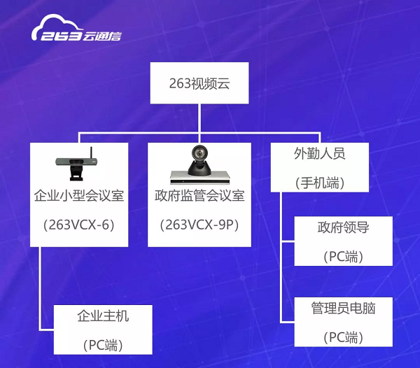目前,市面上的云視頻會議服務商大多采用軟件與硬件相結合的服務模式,形成了針對政府行業的解決方案。263視頻會議基于混合云分布式架構的高兼容性,可實現與硬件終端互聯,支持PC端、手機端入會,在針對監管部門的視頻會議解決方案中制定了更靈活的應用方法。