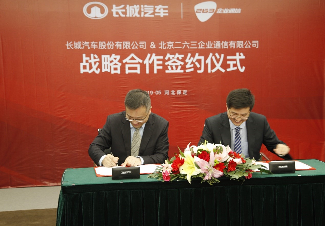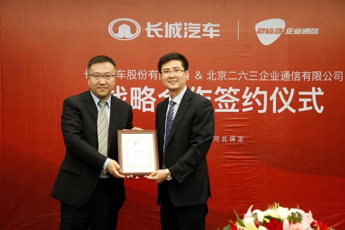 2019年5月10日,北京二六三企業通信有限公司與長城汽車股份有限公司于保定長城汽車技術中心正式簽署戰略合作協議。263副總裁李玉杰先生、長城汽車信息總監竇志領先生出席了本次簽約儀式。