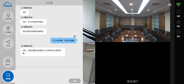 為了能令客戶對263視頻會議產品的兼容性和易用性有最直觀的了解,263視頻客服事先在公司內的一間中型會議室中部署了263智能終端VCX-6,可在視頻客服坐席為客戶講解產品時,進入會議室與客戶通過視頻會議終端進行對話,并展示263VCX-6的產品性能。