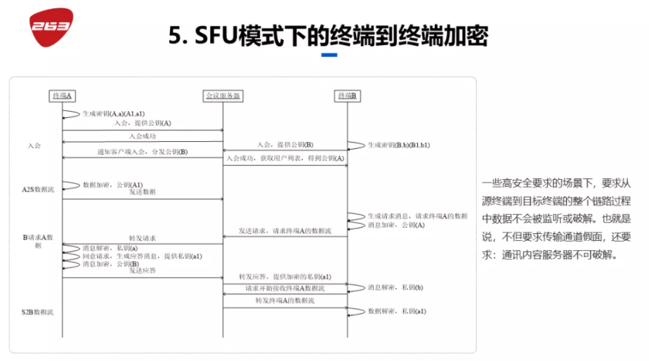這就實現了整個會議中每個終端到服務器之間的信道是加密的,服務器會把收到的數據解密、組包、重新加密、發送。它存在的問題是服務器在一系列處理過程中,內存CPU消耗比較高。