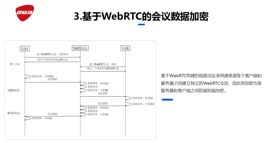 下面,我重點講一下基于WebRTC的數據加密。為更好地保障客戶的信息安全,263的云視頻服務使用的是自研的WebRTC技術,并且在視頻會議數據的安全性上著重做了加固。