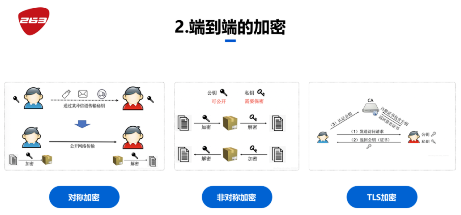 第三類是TLS加密。TLS加密的優勢是在非對稱加密的基礎上,解決了身份認證問題。加密通信過程是先向認證機構申請證書,把證書認證為公鑰發送給對方,對方收到證書后在第三方驗證其證書是否有效,兩方的驗證通過后開始公鑰加密,私鑰解密通信的過程。