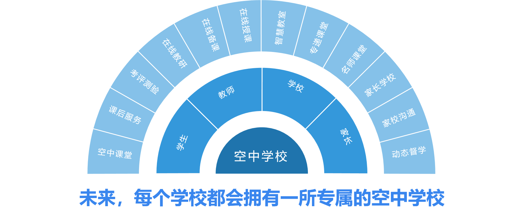 空中學校是針對體制內K12學校量身定制的集“智能管理、在線教學、教師培訓、家校溝通”四位一體的智慧教育服務平臺。空中學校是學校的智慧教室、教師的教學與專業發展平臺、學生的空中課堂、家長的信息互動平臺與線上學校,將助力學校建設專屬的云端學校,打破學校邊界,推進線上線下教育融合、推動優質教育資源共享。
