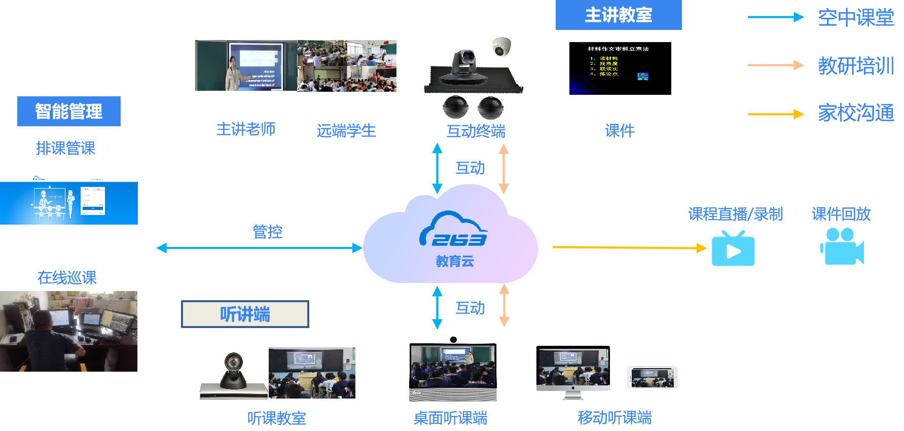 引入263空中學校解決方案,基于大數據、云計算等先進技術的智慧教育一站式綜合應用平臺。平臺涵蓋了在線直播系統、在線學習系統、視頻課程回看系統、教學排課系統、學員管理系統、教務管理系統、大數據分析系統等多個功能子系統。