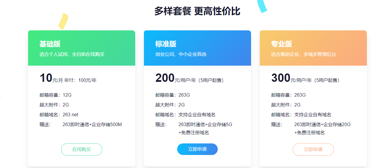 當然購買企業郵箱時各個服務商會根據實際情況,價格上略有優惠折扣。263企業郵箱擁有多樣的產品套餐,性價比更高。