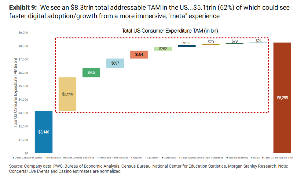 據知名投行摩根士丹利調研發現,美國日活用戶每年花費在數字媒體的時間總計高達110億天。另外,美國潛在消費市場空間(TAM)高達8.3萬億美元,涵蓋房地產、汽車、零售、游戲等領域,其中5.1萬億美元來自沉浸式體驗。沉浸式體驗可以在更高的水平上獲得商業價值回報。機構預計,元宇宙很可能成為下一代社交媒體、流媒體和游戲平臺,并且與當前的數字平臺發展路徑相似,元宇宙最初極有可能成為線下產品的廣告和電商平臺。