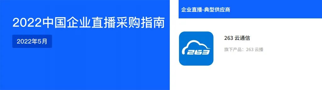 日前,國內知名數字化產品點評調研機構字母點評發布了《2022中國企業直播采購指南》,263旗下企業直播產品263云播憑借在產品實力、場景覆蓋、服務保障等多個維度的絕對實力,成功入選該指南,被評為中國企業直播市場典型供應商。