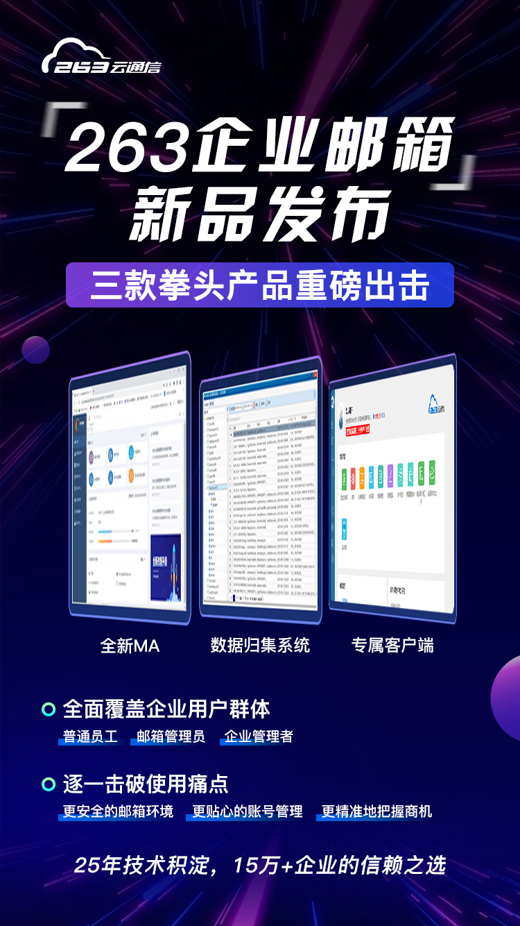 在產品研發推進方面,263始終樂于聆聽合作伙伴的心聲。隨著數字創新深入各行各業,外貿行業在國家政策利好的當下,“上云出海”已成趨勢。杜鳴提到,263企業郵箱穩定服務的15萬家企業客戶中,外貿客戶占有極高比重,所以在新產品的推進上也會依據外貿行業的實際需求進行有針對性的優化和研發。會上,杜鳴給所有合作伙伴帶來了三款全新產品——新版企業郵箱管理后臺MA、數據歸集系統和263企業郵箱專屬客戶端,滿足不同的企業用戶角色需求。