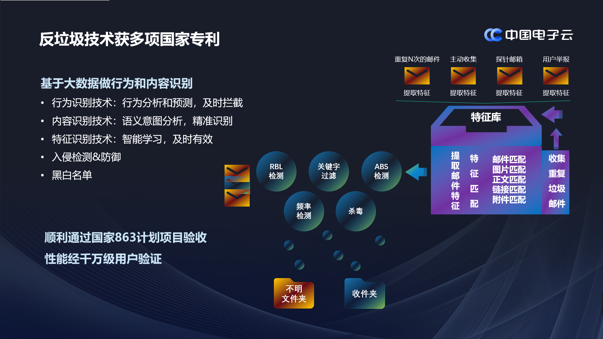 中國電子云郵箱擁有業內領先的調度算法,能夠全面保障郵件投遞的速度和效率,其智能反垃圾技術曾通過國家863項目A級驗收,擁有自主知識產權并獲國家專利,極大提高垃圾郵件過濾準確度。正式切換中國電子云郵箱后,垃圾郵件驟減,郵件收發全球暢通,自建郵箱時期存在的問題都得以解決。