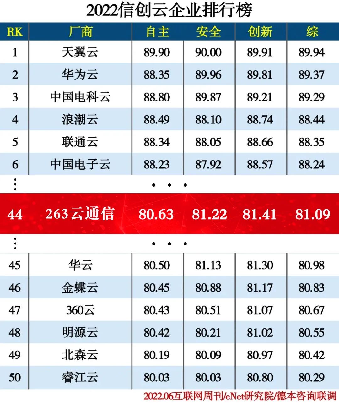 近日,中國科學院《互聯網周刊》、eNet研究院、德本咨詢聯合發布了“2022信創云企業排行榜”,該名單基于自主、安全、創新三個維度作為衡量企業信創實力的關鍵指標進行綜合評審,263再度成功入選并躋身50強。