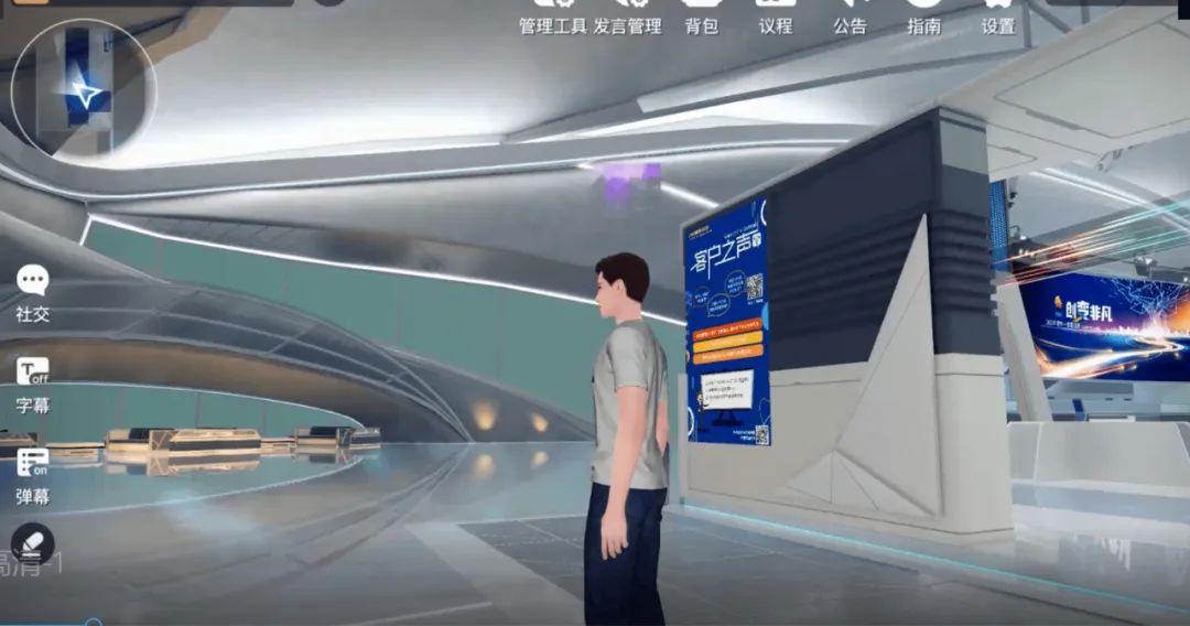 入場后,員工可自由操縱虛擬分身,漫步在會場內,穿梭于虛擬與現實之間,一邊瀏覽兩側宣傳展板,一邊實時聆聽發布重磅信息。同時對于感興趣的海報,員工還能隨心切換觀看視角,多角度欣賞,讓線上展廳既無限趨近于線下真實體驗,又迸發出虛擬玩法的獨特火花。