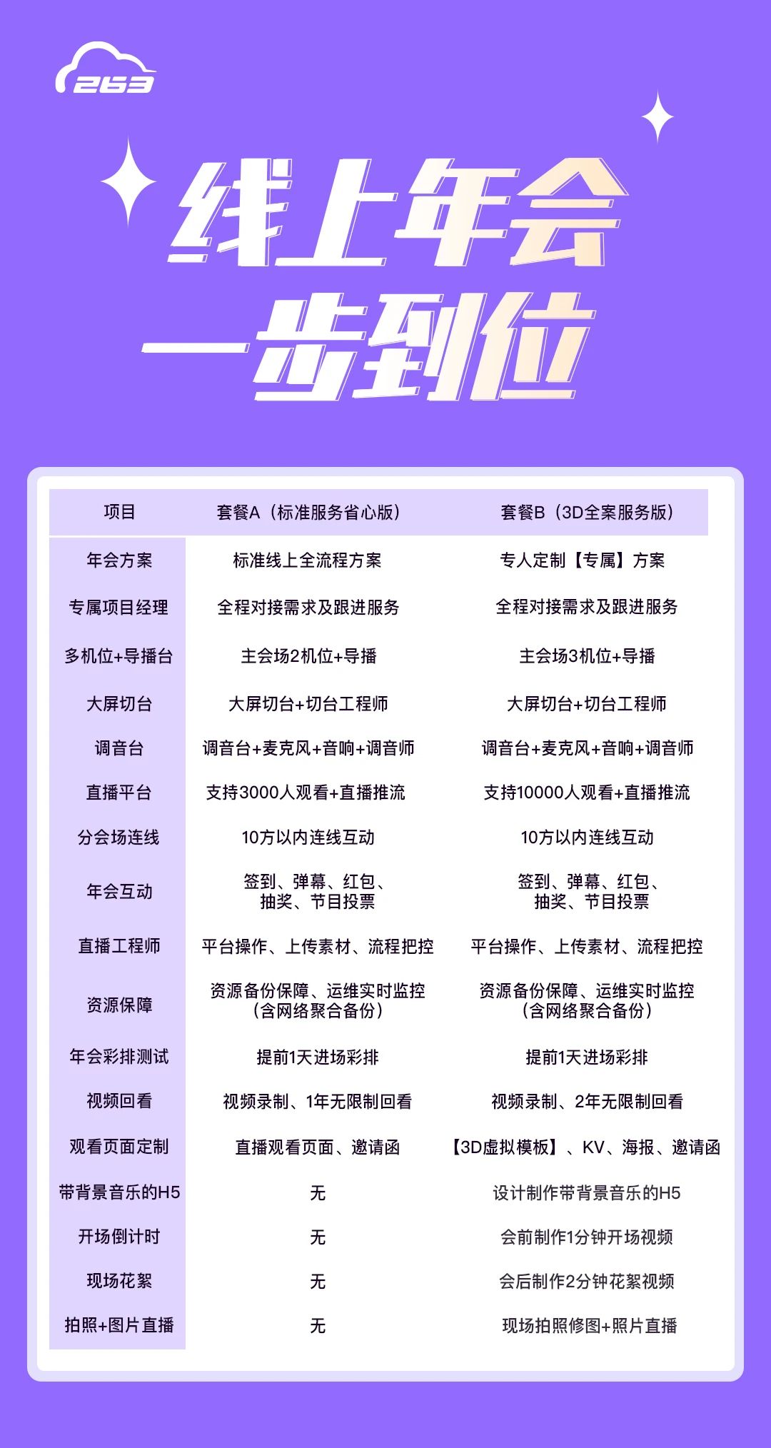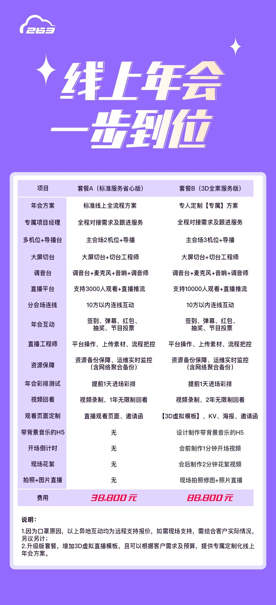 為了給企業提供更優質、更專業的年會直播服務,今年263推出【標準服務省心版】和【3D全案服務版】兩款專業級線上年會解決方案,包含從年會方案制定、傳播物料設計、專業硬件設備支持、線上流程把控以及會后支持等服務。