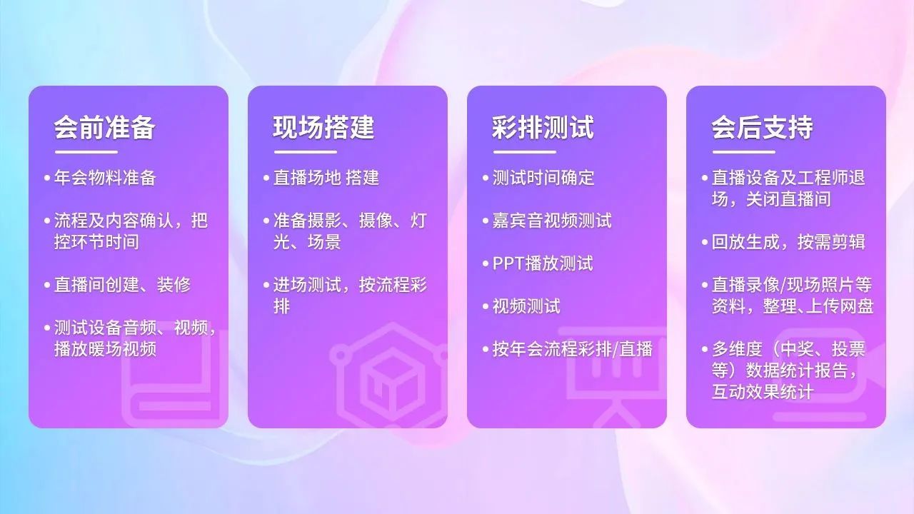 企業對線上年會最首要的要求是穩,對線上年會而言,想要確保直播穩定以及內容形式的多樣性,離不開靠譜的平臺,更離不開專業服務團隊的全流程保障。