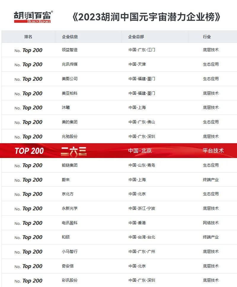 日前,胡潤百富發布了《2023胡潤中國元宇宙潛力企業榜》,列出了元宇宙領域最具發展潛力的中國企業200強,分為八個階段:最具潛力Top 2、Top 5、Top 10、Top 20、Top 30、Top 50、Top 100和Top 200,另外還有30家“未來之星企業”。263集團憑借在過去一年中多項場景應用的亮眼表現和出色的業務發展潛力,成功入選,成為元宇宙領域最具發展潛力的中國企業200強。
