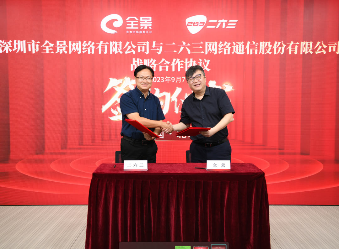 9月7日,263集團全資子公司北京二六三企業通信有限公司(以下簡稱“263”)與深圳市全景網絡有限公司(以下簡稱“全景網”)戰略合作簽約儀式成功在全景網北京分公司路演廳舉行。