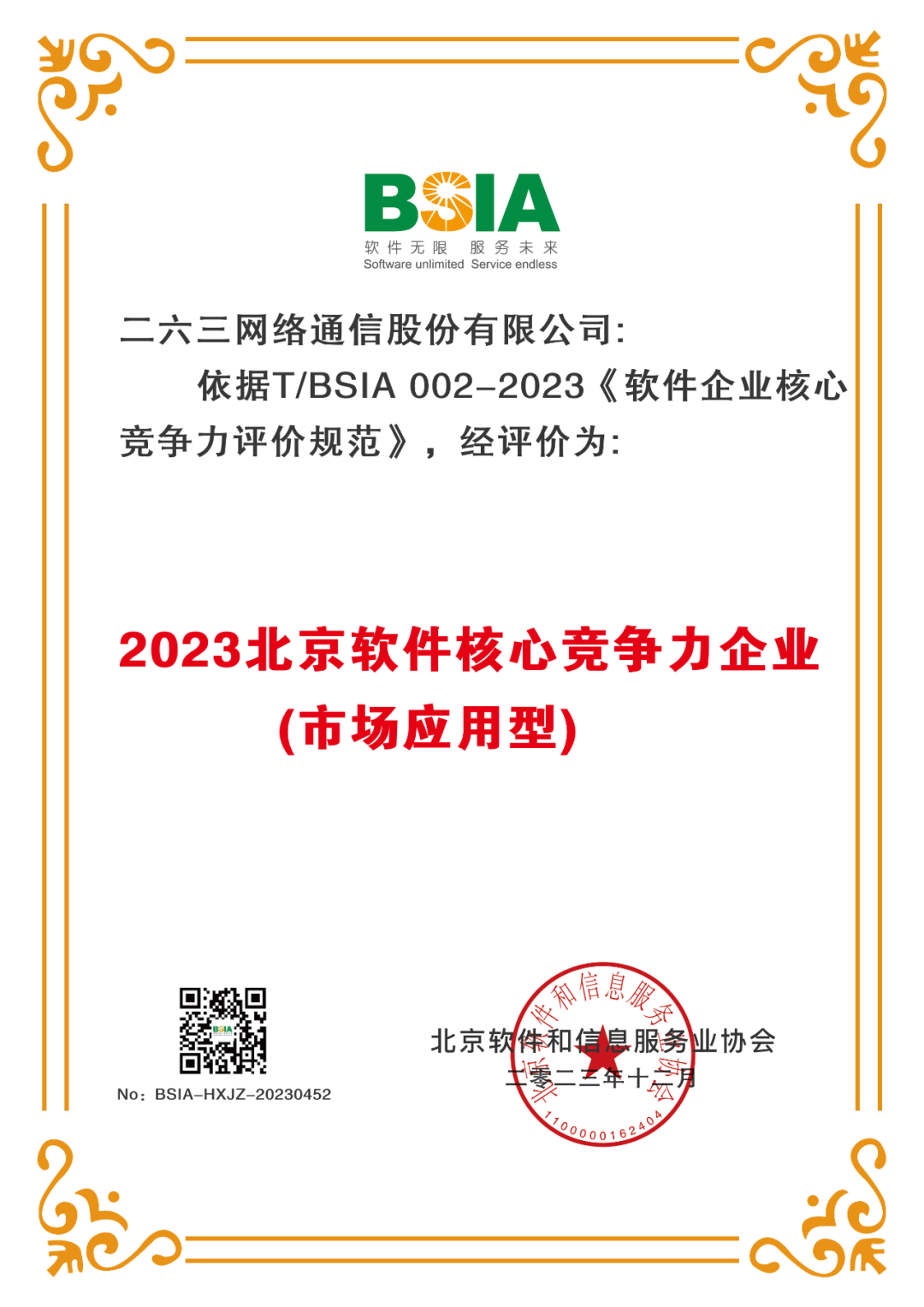 據悉,“2023北京軟件核心競爭力企業”主要依據《軟件企業核心競爭力評價規范》(T/BSIA 002-2023)團體標準,分別從產業帶動、技術創新、市場影響和業務前瞻等四方面進行考量,經過評選出具備核心競爭力的平臺賦能型、技術研發型、市場應用型、業務探索型四大類型企業。此次入選是對263積極開拓創新場景、創新應用、創新業務賦能數字經濟的充分肯定。