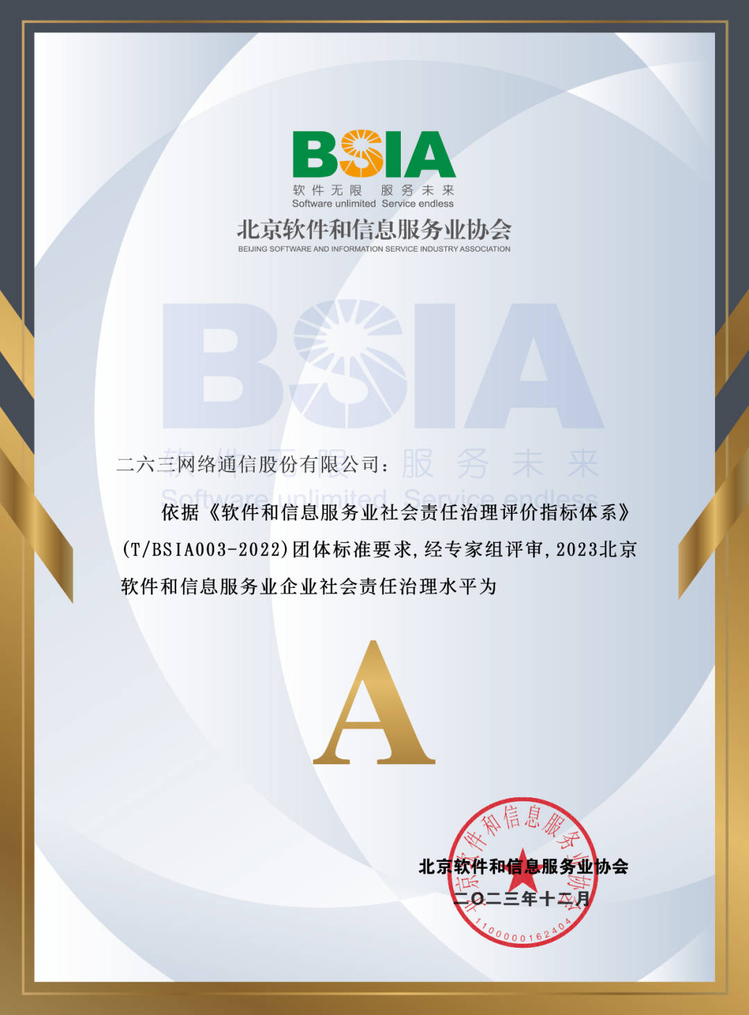 作為互聯網通信行業的領跑者,263憑借優秀的綜合市場競爭力、良好的發展態勢、創新的市場應用方案等多層面的核心實力成功入選2023年北京軟件核心競爭力企業(市場應用型)榜單,并因在鄉村振興、誠信經營等維度的優異表現獲評社會責任治理水平A級企業。