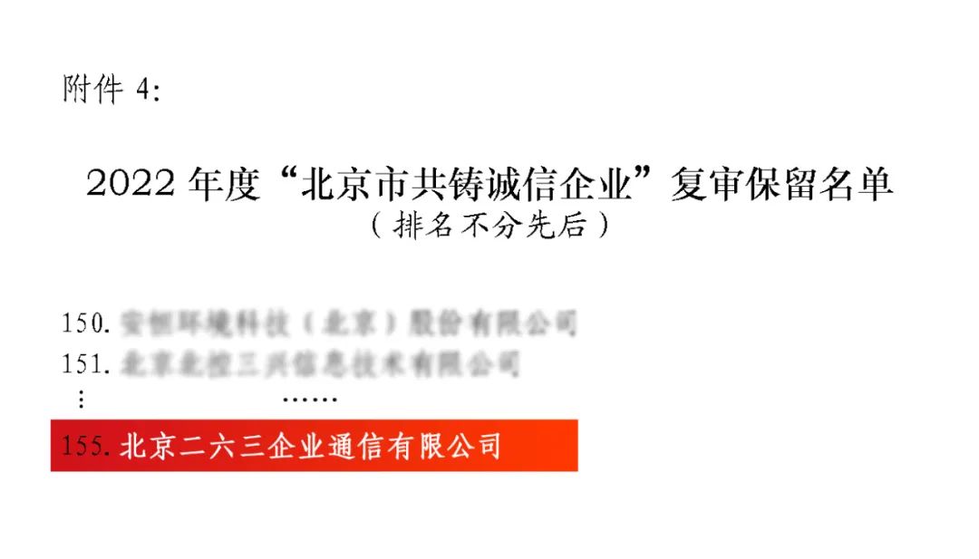 近日,在由首都精神文明建設委員會辦公室、北京市經濟和信息化局等八部門組織開展的“百業萬企”共鑄誠信文明北京活動中,公示了2023“北京市共鑄誠信企業”候選名單及2022“北京市共鑄誠信企業”復審保留名單。作為2022年度的“北京市共鑄誠信企業”,經各區各行業協會商會、市級主管部門以及專家的嚴格考察,263順利通過復審,持續閃耀2023“北京市共鑄誠信企業”榮譽榜單。