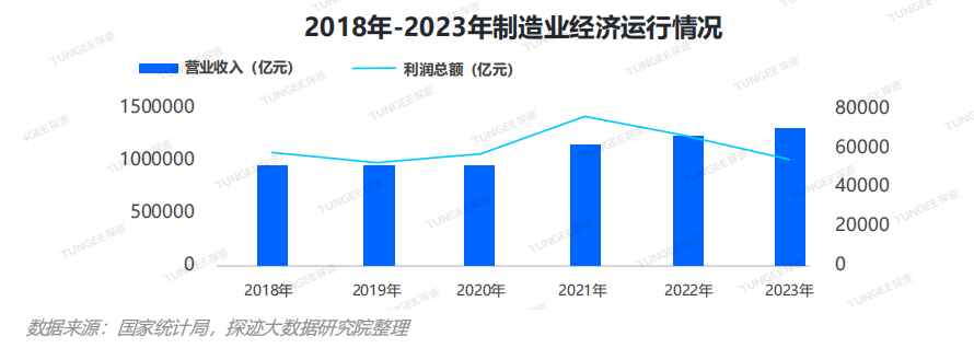 制造業是我國國民經濟的支柱,為我國的經濟高速發展起到了主要推動作用。隨著我國經濟發展進入新常態,制造行業也進入轉型升級期,開始從“制造大國”向“制造強國” 高端化躍升。有數據顯示,2023年,我國制造業營業達115.3萬億元,同比增長1.3%,利潤總額達到5.7萬億元,整體呈穩定增長態勢。