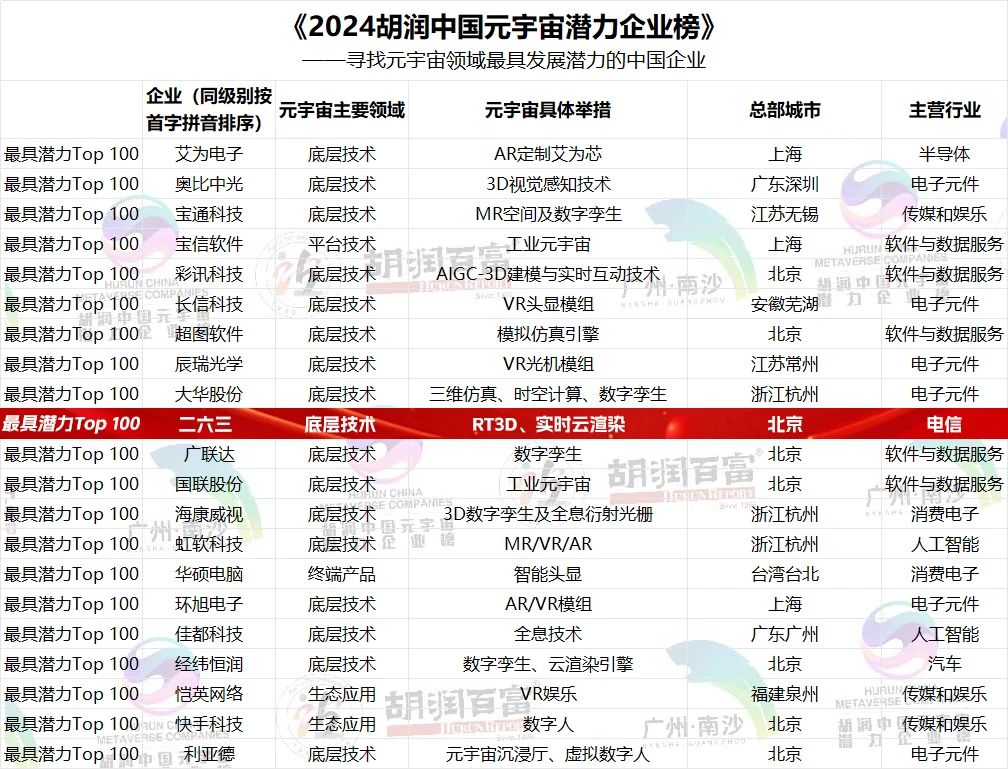 263集團憑借多項場景應用的卓越表現成功入選,成為該榜單最具發展潛力的Top100企業,這也是繼263入選《2023胡潤中國元宇宙潛力企業榜》Top200企業后,再次入選該榜單。