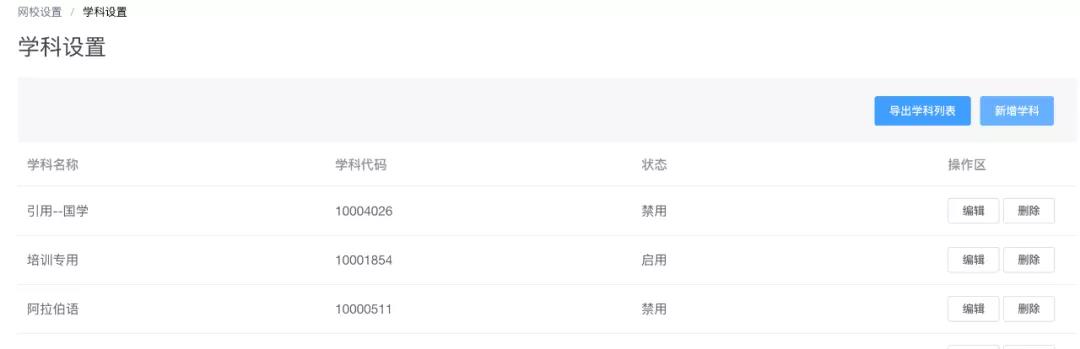2)當前頁可查看學科代碼,或新增學科&導出學科列表