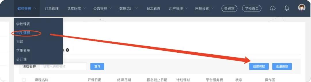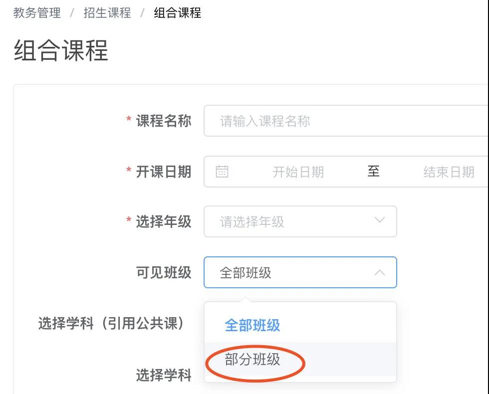 教務端:教務管理_招生課程_創建課程,新增選填項:可見班級;用戶點選后,該課程學生用戶登錄后僅選中的班級可見,支持全選。