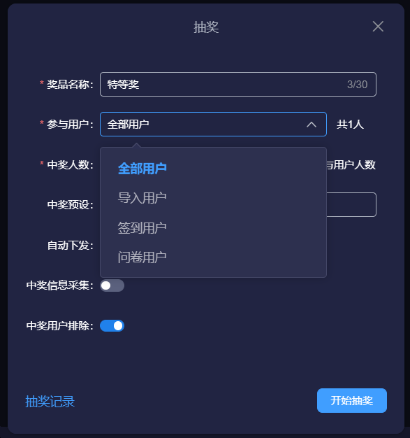 該項功能中,抽獎范圍增加了導入用戶、簽到用戶、問卷用戶,同時,新增中獎用戶排除配置項。