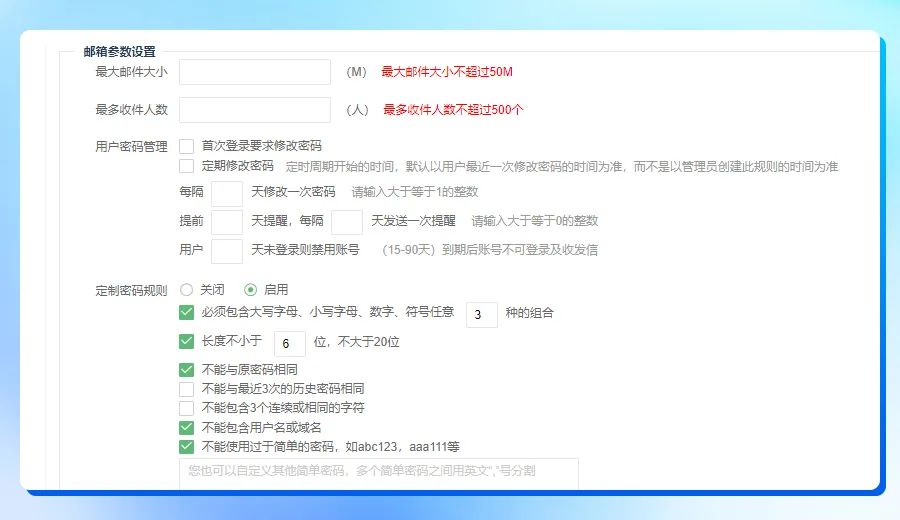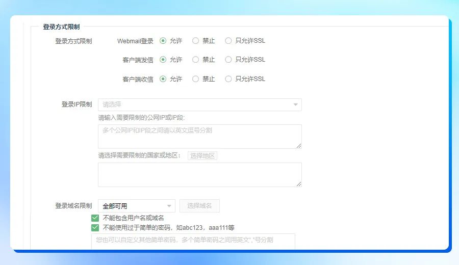 通過【登錄方式限制】自定義郵箱帳號可登錄的范圍,即使帳號被不法分子獲取也無法登錄。