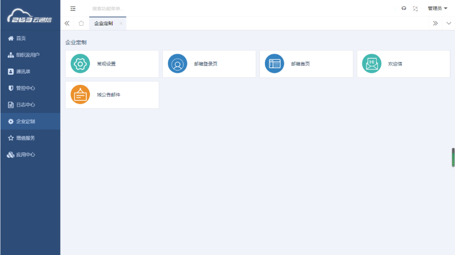 郵箱作為企業運行管理不可缺少的溝通工具,除了承擔著對外信息往來的重任,在企業的對內管理中也扮演著重要角色。在管理員登錄后臺,左側導航欄“企業定制”,可以自定義設置企業logo、企業簽名、郵箱登錄頁、郵箱首頁、歡迎信、域公告郵件等,滿足企業統一化、規范化的管理需求,幫助企業達成管理目標。