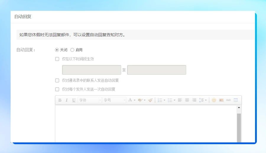 工作中難免遇到請假、休假等不能及時回復郵件的情況,這個時候就可以使用【自動回復】功能,告知對方具體情況。不但滿足企業用戶雙向反饋高效觸達的需求,還可以給客戶留下專業的印象。