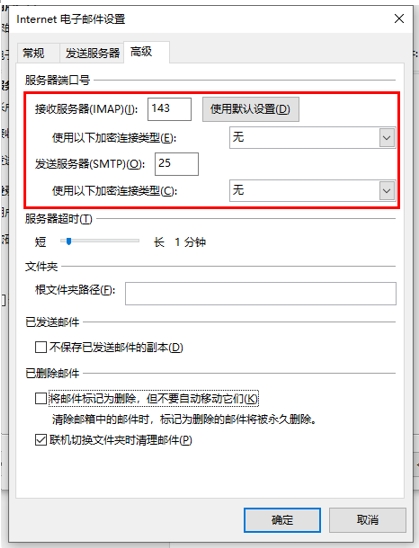 8. 點擊“高級”, IMAP參數設置為:143,SMTP端口參數設置為:25。