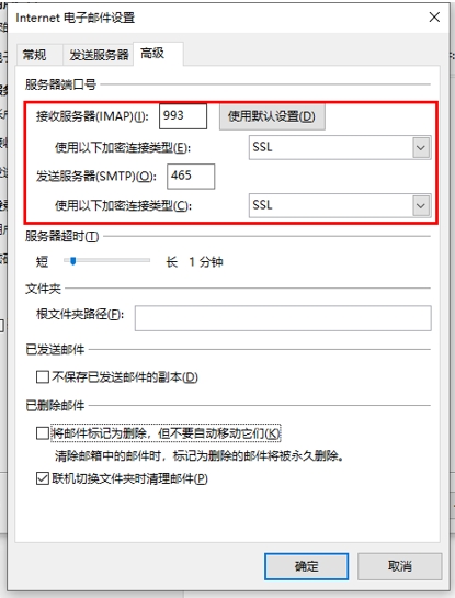 如果您的郵件收發需要采用SSL加密, 請選擇“此服務器要求安全連接SSL”, IMAP參數設置為:993,SMTP端口參數設置為:465,“使用以下加密類型”選擇“SSL”。