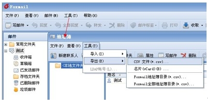 請您點擊Foxmail上“工具-地址簿”,選擇 工具-導出-CSV文件,如下: