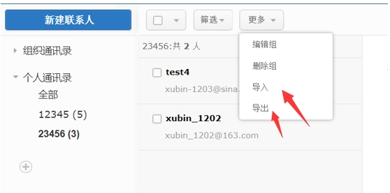 263網頁郵箱中,在“通訊錄-個人通訊錄”中,您可以直接導入或導出地址本: